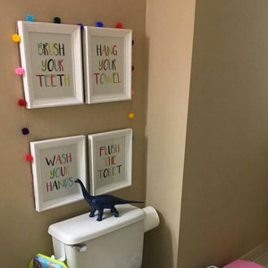 Bathroom art set, kids bathroom sets, flush the toilet, brush your teeth, wash your hands, hang your towel instant download for diy printing.