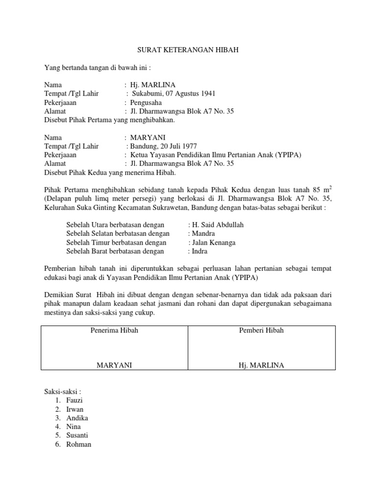 Surat persetujuan hibah dari ahli waris. Contoh surat hibah tanah dan rumah untuk anak. Pastikan untuk mempersiapkan seluruh kebutuhan dokumen dengan baik sebelum memulai proses hibah agar dapat berjalan dengan baik. Surat hibah tanah adalah sautu surat yang mana menjadi bukti otentik bahwa seseorang telah memberikan (menghibahkan) sebagian tanah itu tadi penjelasan beserta 1 contoh surat hibah tanah yang kami berikan pada kesempatan kali ini. Siti robiah tempat /tgl lahir :