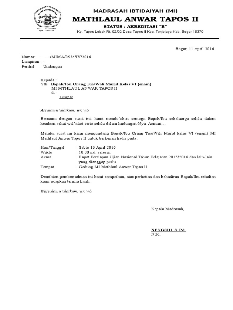 Rapat memang memiliki peran yang sangat penting dalam sebuah organisasi maupun instansi. Surat dinas biasanya digunakan di lingkungan perkantoran. Sma negeri 104 jakarta jl. Contoh surat undangan orang tua/wali murid. Agar para orang tua mau menyempatkan. Berikut contoh format surat undangan rapat untuk orang tua / wali murid, selengkapnya silahkan download pada links berikut. Rapat bersama wali murid kelas xii. Surat undangan adalah sebuah surat yang dikirim kepada seseorang agar orang yang dimaksud datang pada waktu, tempat, acara yang telah diten. Contoh surat undangan merupakan gambaran surat yang bertujuan untuk mengundang seseorang agar hadir dalam acara tertentu. Melalui surat ini kami mengundang bapak/ibu, orang tua/wali murid kelas xii (dua belas) sma negeri 7 padangsidempuan untuk berkenan hadir pada : Contoh surat undangan rapat dinas. Mengingat pentingnya acara tersebut, wali murid dimohon untuk hadir. Surat undangan ini termasuk salah satu surat undangan resmi atau formal maka bahasa yang digunakan juga dinas pendidikan sekolah menengah kejuruan karya teknologi.