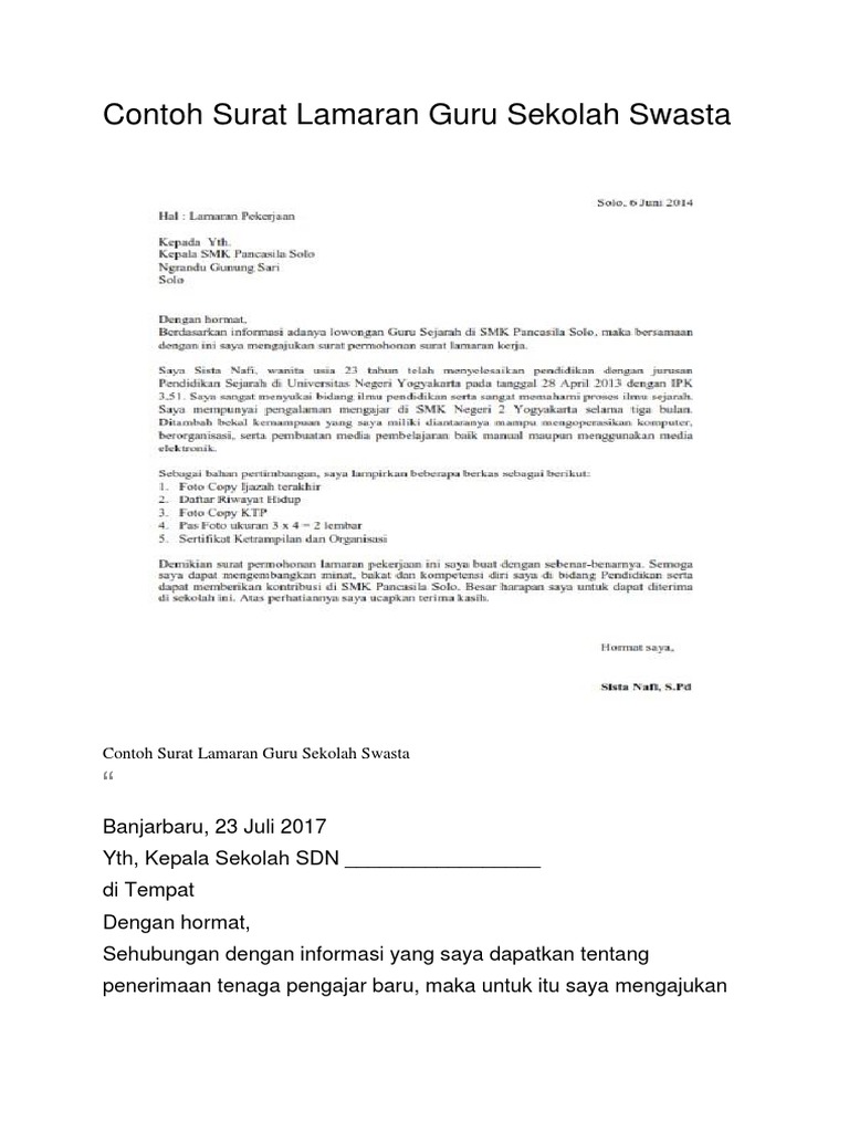 Jakarta, 10 april 1994 pendidikan terakhir : Contoh surat lamaran kerja menjadi guru. Akan tetapi, tak sedikit yang sulit membuatnya mengingat banyak faktor yang harus diperhatikan. 21, kabupaten pasuruan pendidikan terakhir : Smk administrasi nomor contoh surat lamaran kerja guru terbaru. Dokument yang selalu wajib dalam pelamaran kerja iyalah surat lamaran karena sebagai dasar kelengkapan dokument dokument lainnya. Panduan cara membuat surat lamaran seperti lamaran umum, fresh graduate, via email, tulis tangan, sebagai guru, cpns, di hotel, di bank, di toko, rumah sakit, berdasarkan iklan, bahasa inggris, +doc. Bahkan hal itupun dirasakan oleh lulusan dari fakultas pendidikan. Menjadi seorang guru adalah pekerjaan yang paling mulia di dunia. Surat lamaran kerja juga penting bagi kamu yang masih kuliah namun ingin magang di sebuah perusahaan untuk mendapat pengalaman. Untuk tenaga pendidik di smk pada dasarnya membuka peluang mengajar bukan hanya alumni dari fakultas pendidikan tetapi juga dari fakultas lain. Contoh surat lamaran kerja guru. Perhatikan beberapa contoh surat lamaran kerja guru agar kamu bisa membuat surat lamaran kerja terbaik sendiri.