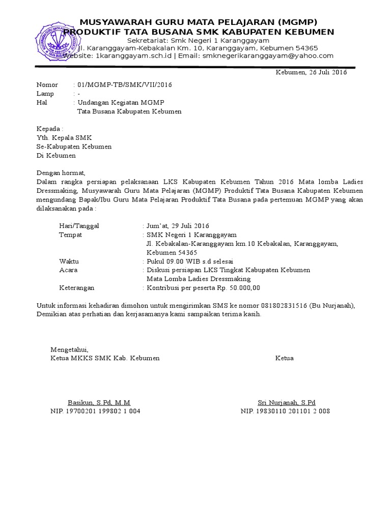 Contoh Surat Undangan Mgmp Bahasa Indonesia : Easysitefam Blog / Jadi, surat ini digunakan untuk kepentingan resmi.. Kedua jenis surat ini memiliki peruntukan tersendiri dan tidak bisa digunakan pada sembarang tempat. Namun penulisan dan gaya bahasa yang digunakan harus tetap sopan dan santun. Surat undangan sendiri terdiri dari surat undangan resmi dan surat undangan tidak resmi. Jadi, surat ini digunakan untuk kepentingan resmi. Contoh surat resmi yang pertama ini untuk undangan kerja bakti di sekolah, dengan tema gotong royong dalam hal atau ajakan undangan untuk membersihkan lingkungan serta lapangan yang ada dibelakang disekolah.